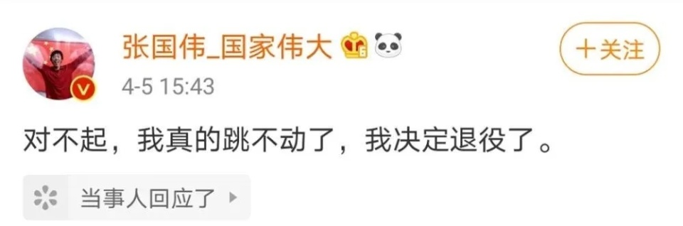 江南体育官方网站2020年初,张国伟宣布退役,他写道:“对不起,我真的跳不动了,我决定退役了。”