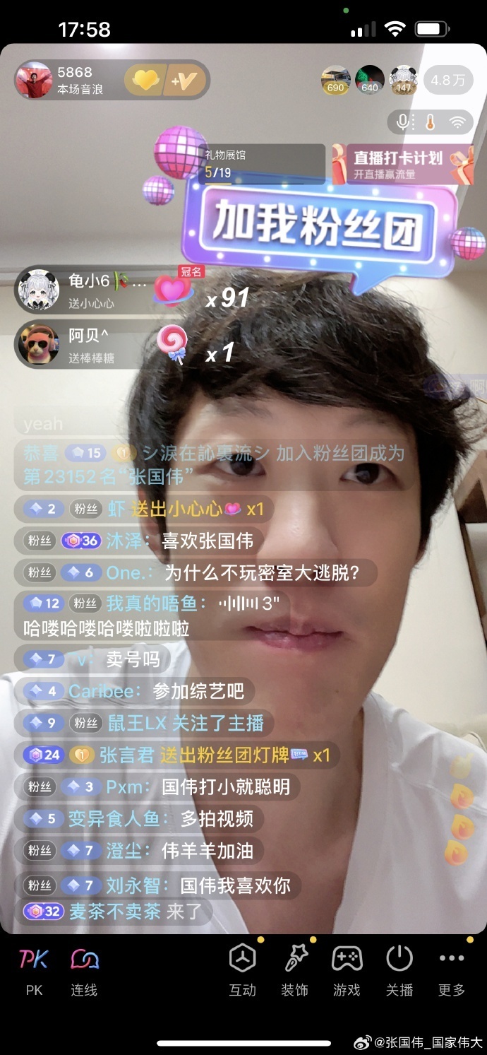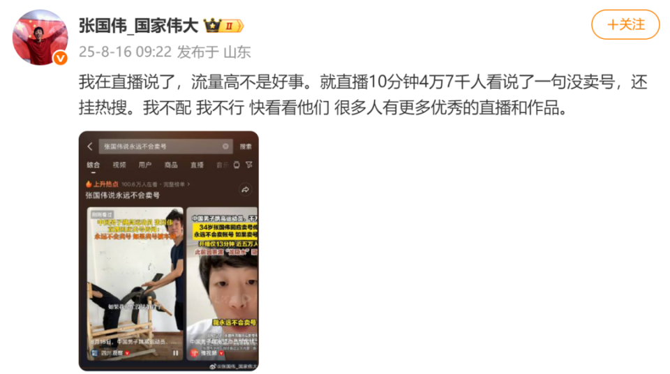 随后,张国伟再次在个人微博发文:我在直播说了,流量高不是好事。就直播10分钟4万7千人看说了一句没卖号,还挂热搜。我不配,我不行,快看看他们,很多人有更多优秀的直播和作品。