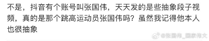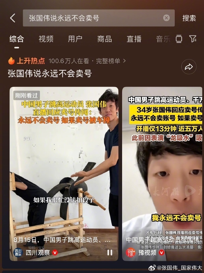 8月15日,中国男子跳高运动员、千万粉丝网红张国伟在直播中回应卖号传闻称:“我永远不会卖号,如果我卖号的话我出门就被车撞好不好。如果我很忙没办法给大家拍段子,我的团队也会给大家带来欢乐。”