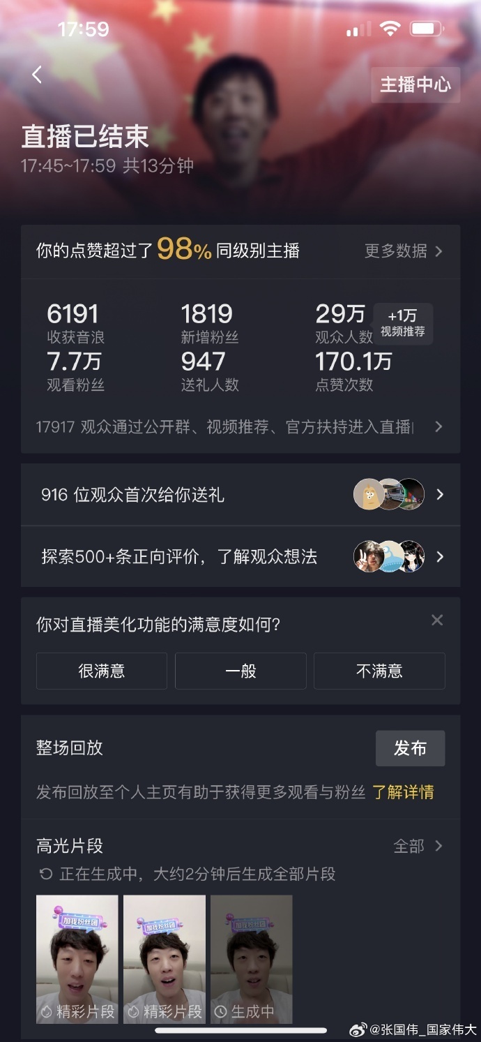 当晚,张国伟在直播结束后在个人微博发文:直播13分钟就4万8千人......别给我这么大流量,我不配。我就证明一下没卖号......都是自己团队拍摄。我有时间就会出镜。