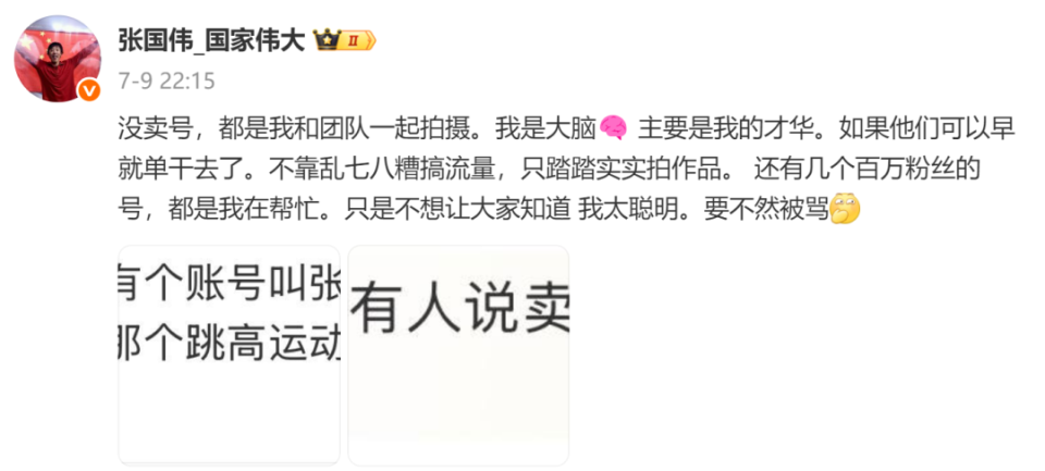 此前,张国伟曾于今年7月在个人微博发文回应卖号传闻称:没卖号,都是我和团队一起拍摄。我是大脑,主要是我的才华。如果他们可以早就单干去了。不靠乱七八糟搞流量,只踏踏实实拍作品。还有几个百万粉丝的号,都是我在帮忙。只是不想让大家知道我太聪明。要不然被骂。